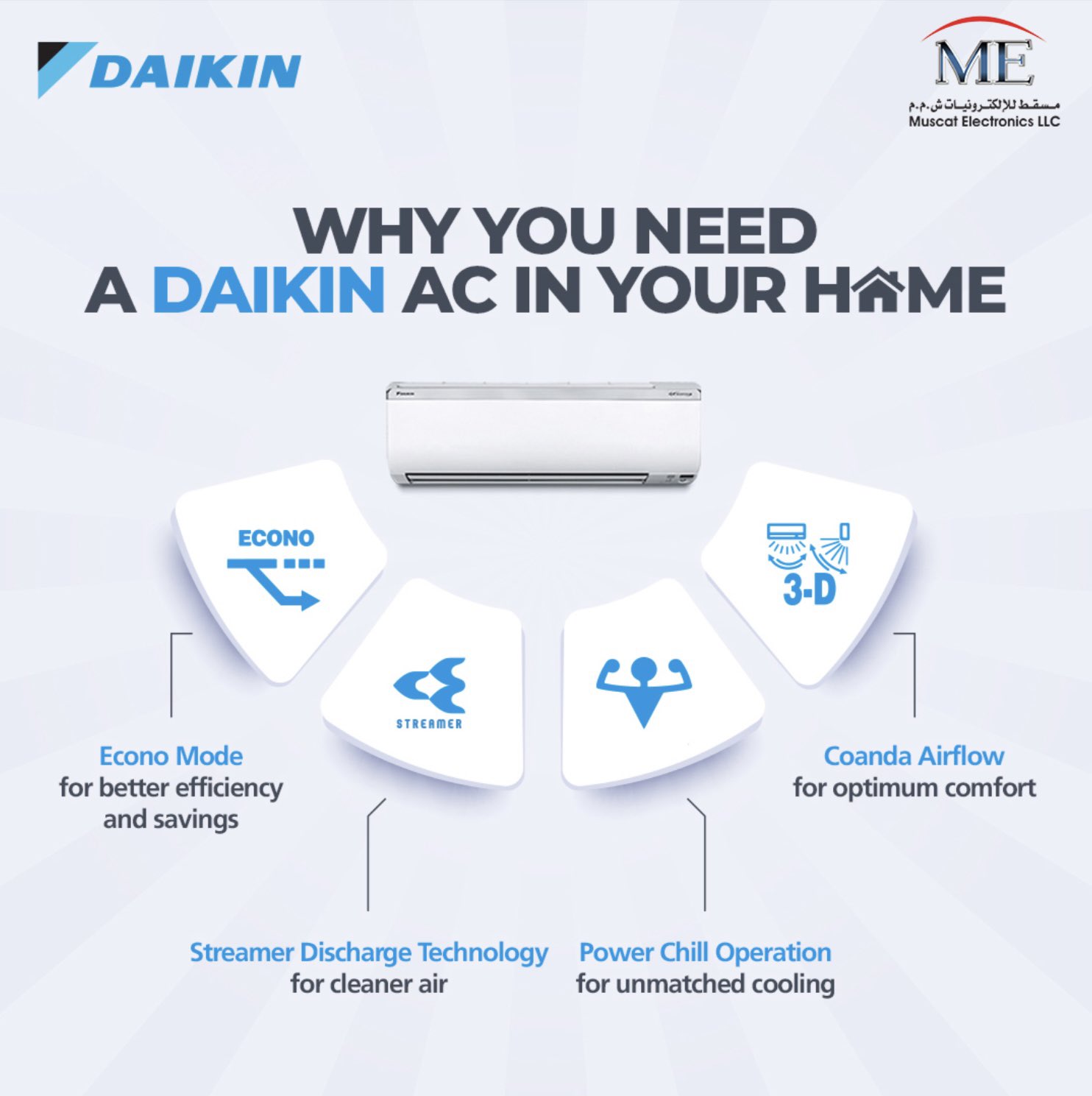 ME is the National distributors for several world renowned brands like; Daikin and Chigo in the field of air-conditioning; Ricoh and Hitachi in office automation solutions.