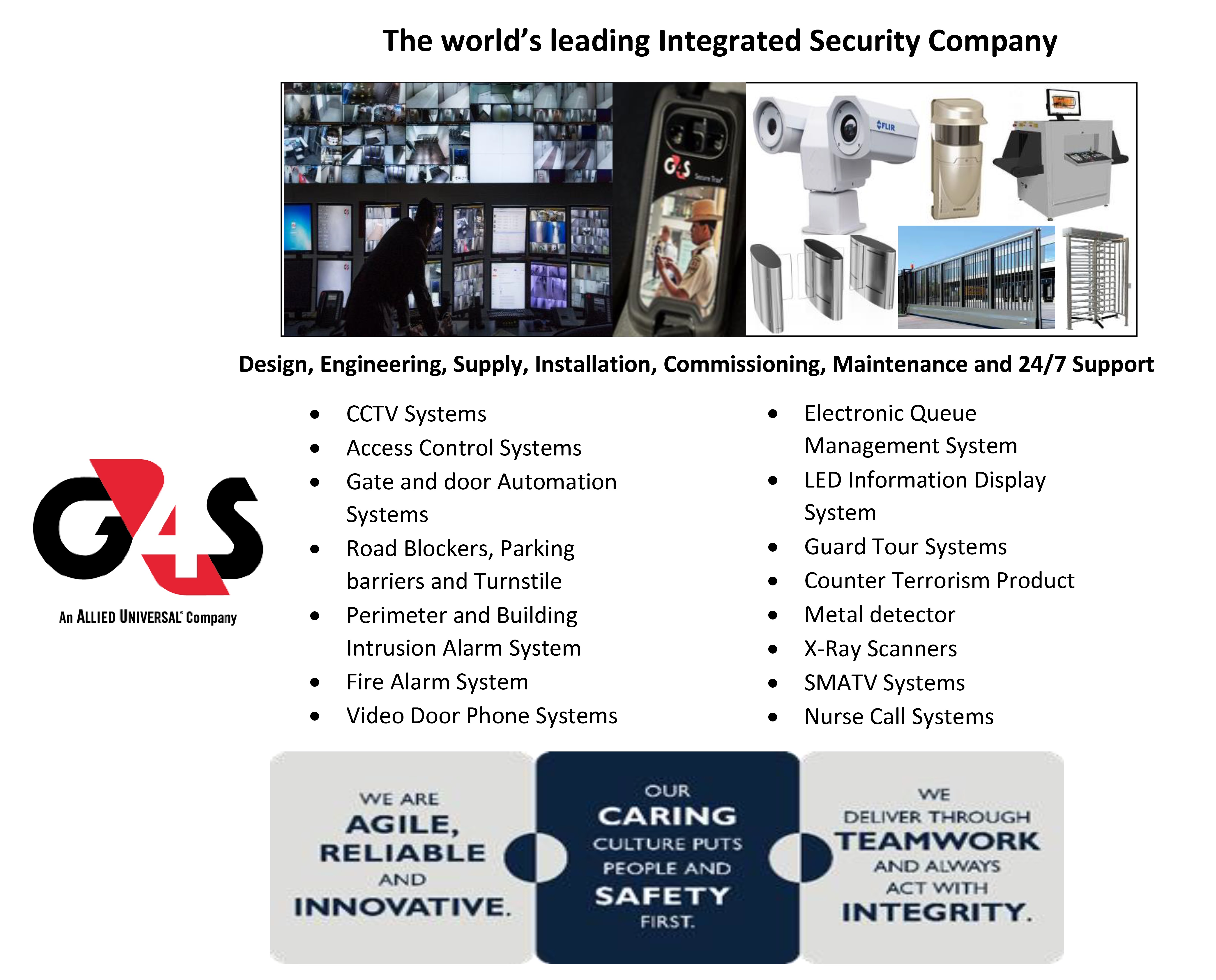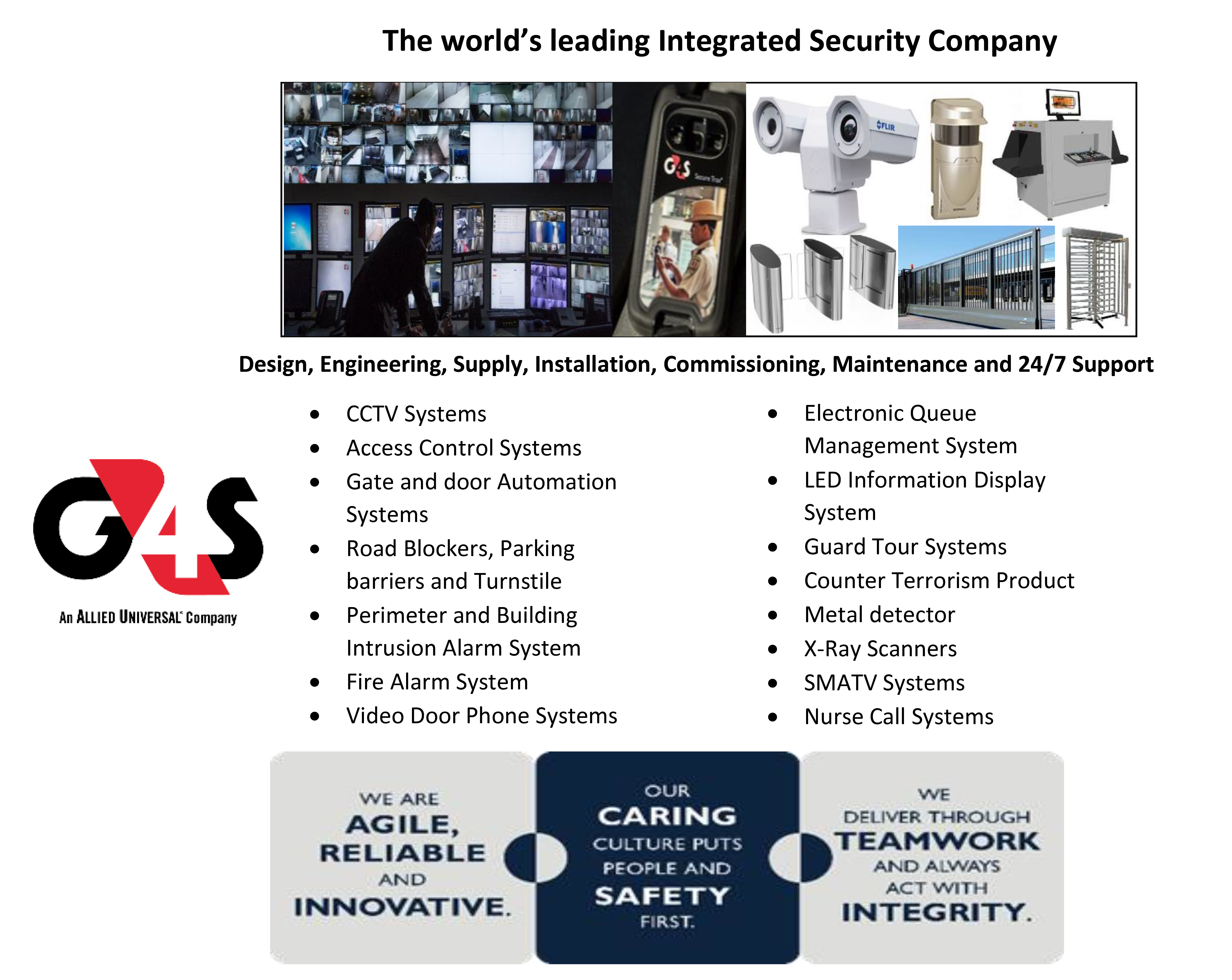 G4S is part of Allied Universal®, a leading security and facility Services Company that provides proactive security services and cutting-edge smart technology to deliver tailored, integrated security Solutions that allow clients to focus on their core business. Through a global workforce of approximately 800,000 people, we leverage best practices in communities all over the world. With revenues at approximately $20 billion, we are supported by efficient processes and systems that can only come with scale to help deliver our promise locally: keeping people safe so our communities can thrive.