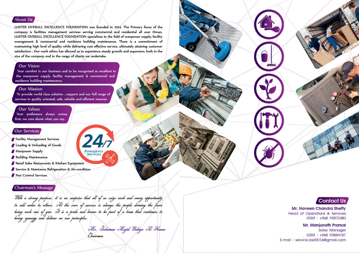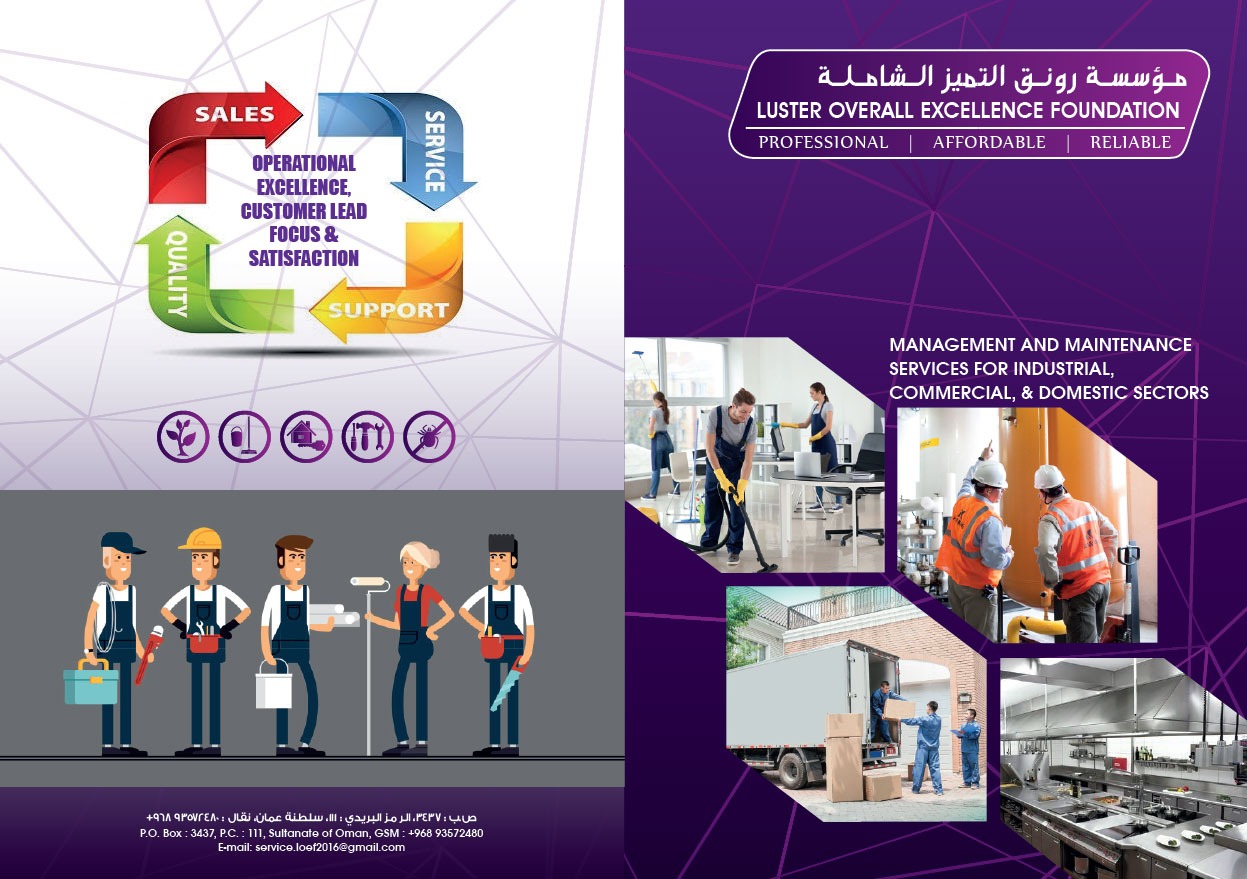 LUSTER OVERALL EXCELLENCE FOUNDATION was founded in 2014. The Primary focus of the company is facilities management services serving commercial and residential all over Oman. LUSTER OVERALL EXCELLENCE FOUNDATION specializes in the field of support maintenance & retail sales of construction, electrical, industrial & residential equipments. There is a commitment of maintaining high level of quality while delivering cost effective results. Our work ethics has allowed us to experience steady growth and expansion, both in the size of the company and in the range of clients we undertake.